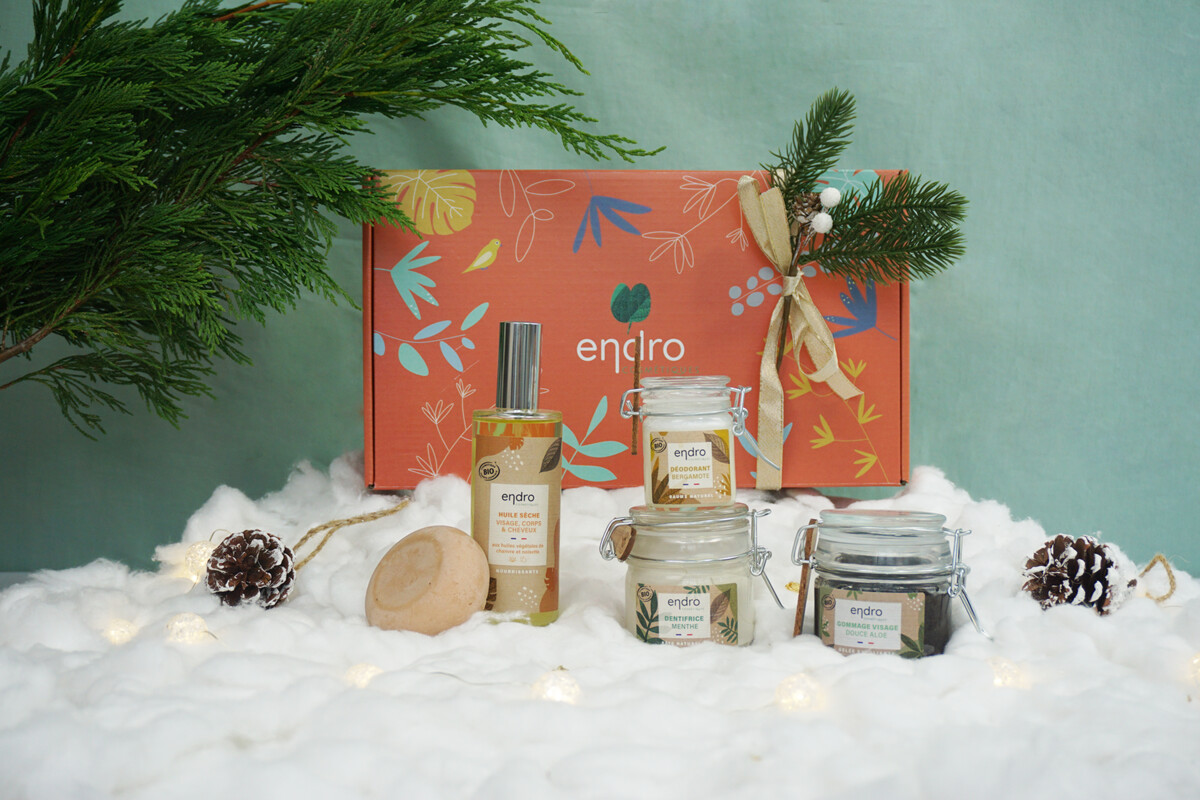 Le coffret de Noël Endro est composé de 5 cadeaux fabriqués de façon artisanale en Bretagne : un déodorant solide à la bergamote, un dentifrice en pâte à la menthe, un gommage visage doux Aloe, un shampoing solide granit rose, et une huile sèche 3 en 1.