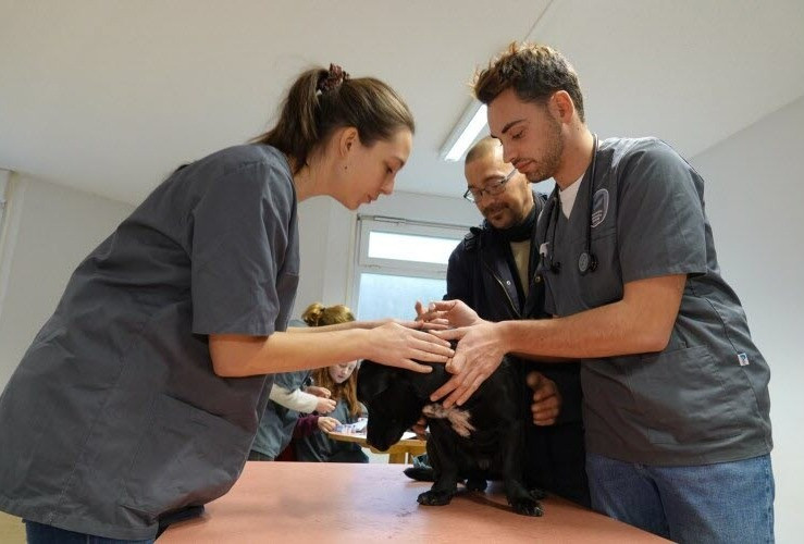 Des étudiants de l’école vétérinaire de Lyon supervisés par un professeur dispensent gracieusement des soins aux animaux des personnes n’ayant pas les moyens de les faire soigner.