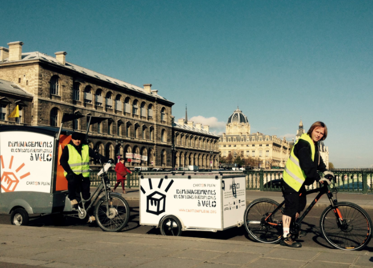 En parallèle, Carton Plein met au point un service de déménagement et de livraison de meubles 100 % écologique, puisque le transport s’effectue avec des vélos cargos électriques et des remorques spécialement conçues pour supporter de lourdes charges. Moins coûteux que des déménagements classiques, les déménagements proposés par Carton Plein ont également une dimension sociale et solidaire, puisque l’association emploie des personnes en grande précarité.