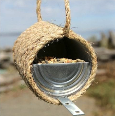 1. Une mangeoire à oiseaux avec une boîte de conserve et du sisal