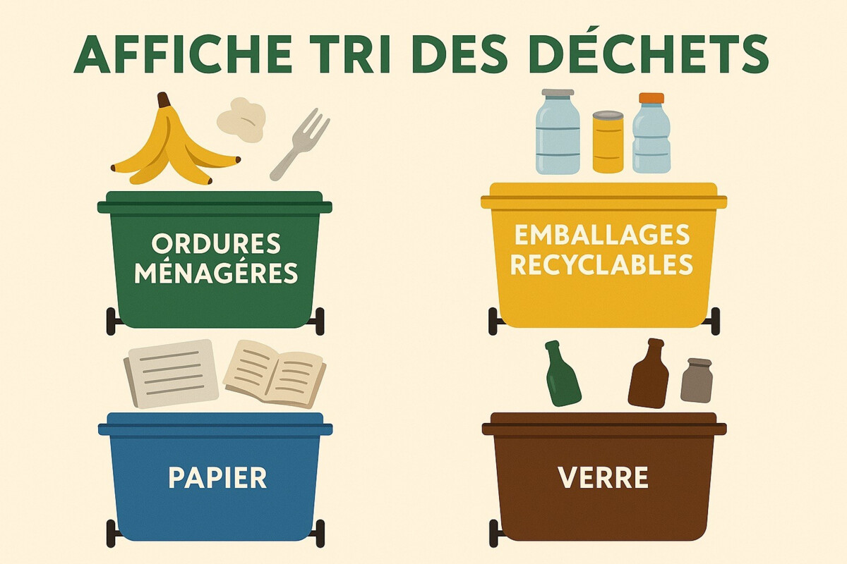 De nombreux sites officiels (et certains syndicats de collecte) proposent des affiches personnalisables selon votre adresse. Vous pouvez également les enrichir avec des pictogrammes, des couleurs ou des exemples concrets de votre quotidien.