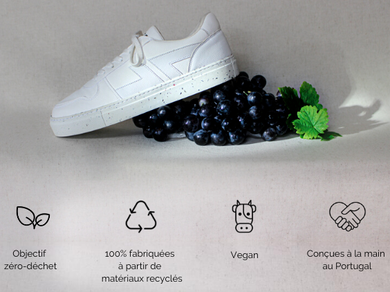 Imaginées à Bordeaux, la ville du vin, les chaussures sont fabriquées au Portugal. Le pays possède un savoir-faire dans le fait main. Le cuir réalisé à base du raisin a été élaboré par une société basée en Italie qui a pignon sur rue et qui collabore déjà avec de grandes marques.