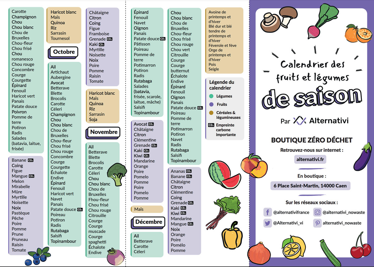 Pour vous aider dans vos choix, notre calendrier des fruits et légumes de saison mentionne également les céréales et légumineuses à retrouver à différents moments de l’année. Mais surtout la petite indication « CO2 » vous informe sur les produits qui respectent la saisonnalité, mais qui ont une empreinte carbone importante.