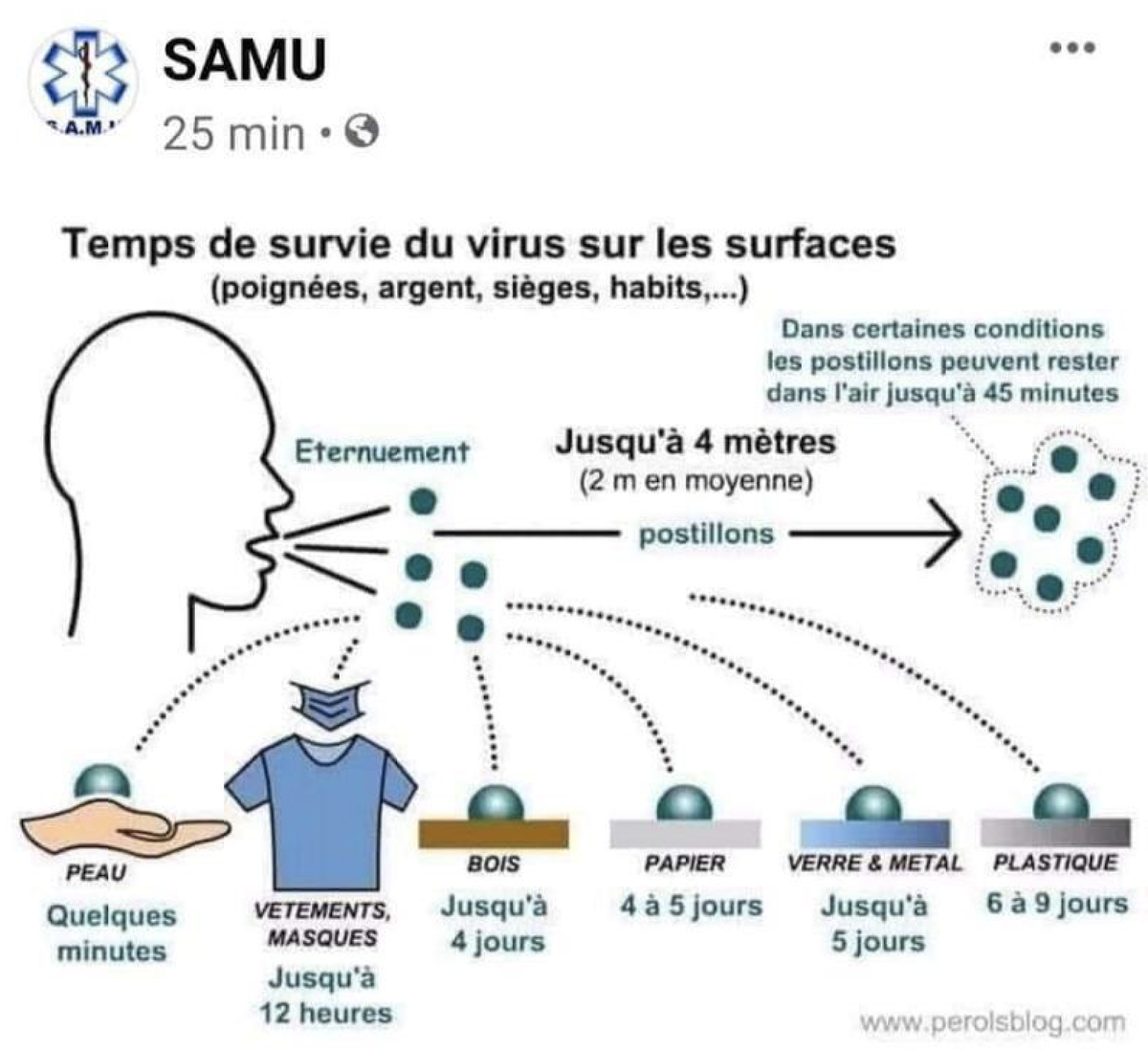 Il est bon de savoir qu’en éternuant, un postillon peut être expulsé jusqu’à 4 mètres. Dans l’air et selon certaines conditions, les postillons peuvent perdurer jusqu’à 45 minutes. Il est donc essentiel d’éternuer et de tousser dans son coude pour ne contaminer personne.