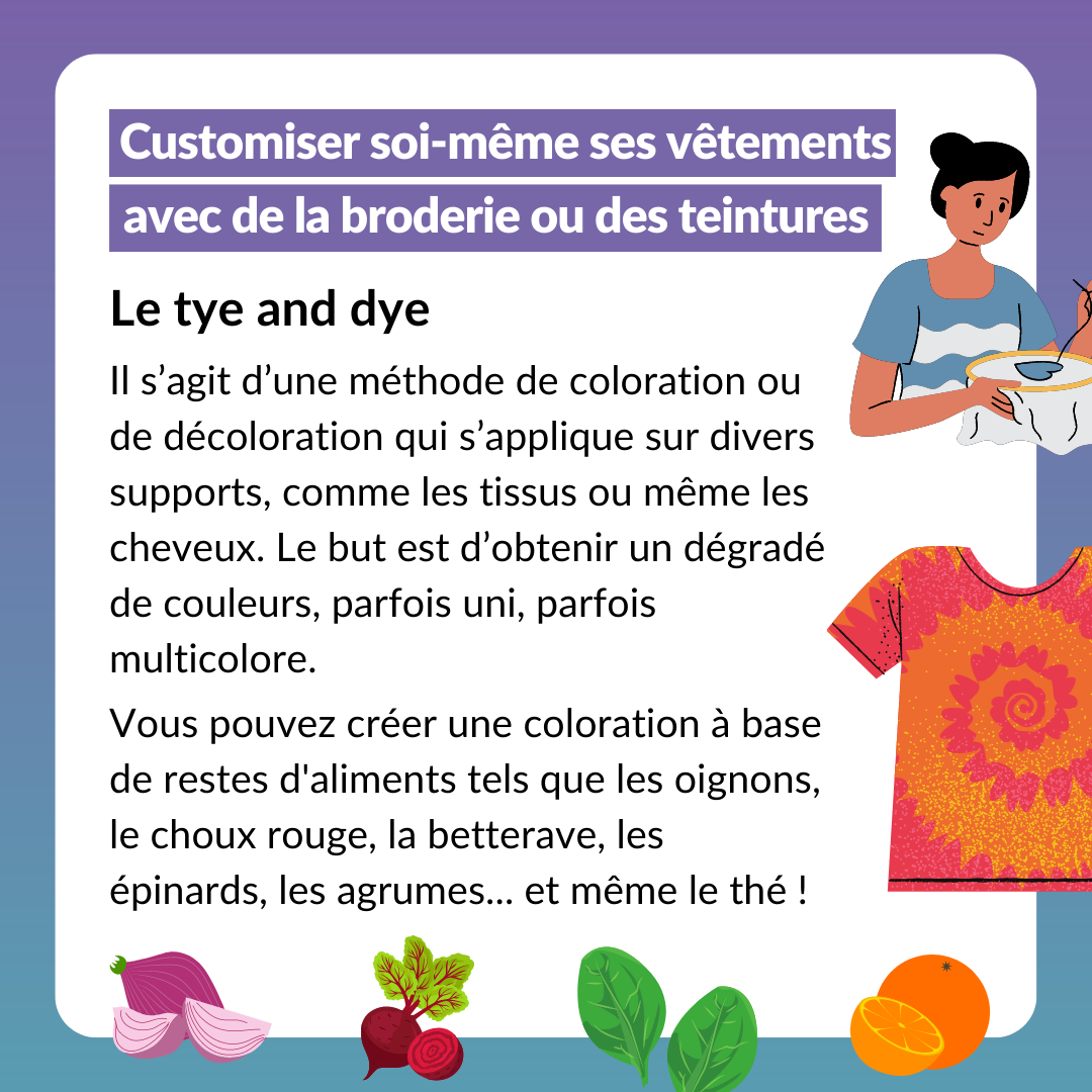 Pratiquer le DIY, qui signifie littéralement « fais-le par toi-même », revient à fabriquer de ses propres mains divers articles et produits au lieu de continuer à les acheter par réflexe ou par habitude. Dans le domaine de l’habillement, c’est le grand retour du tricot et de la couture. Mais la customisation des vêtements peut aussi passer par de la broderie ou des teintures. C’est ce qui permet par exemple de faire des vêtements tie and dye avec des produits naturels.