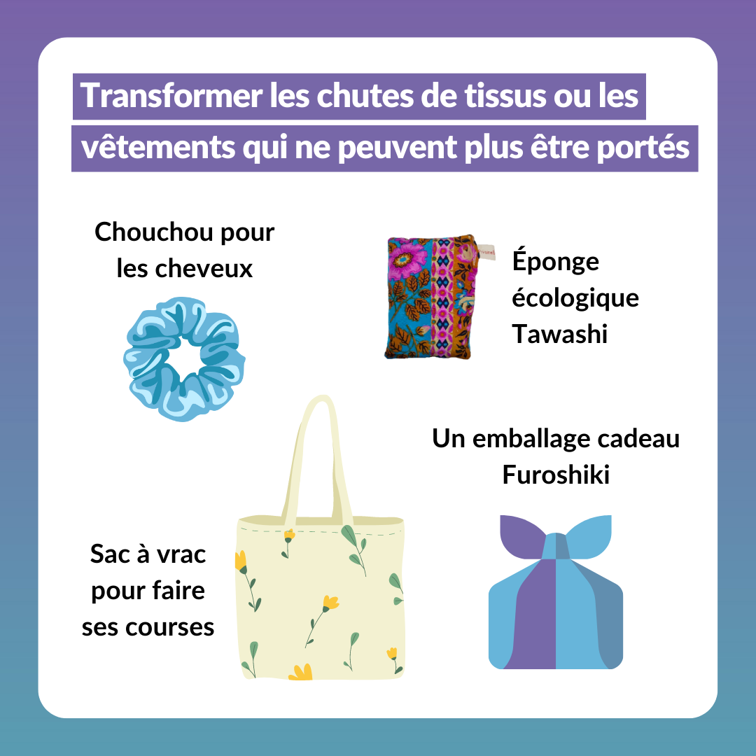 Les chutes de tissus ou encore les vêtements qui ne peuvent plus être portés servent alors à la confection d’accessoires beauté comme les chouchous à cheveux ou encore à la fabrication d’articles zéro déchet du quotidien, tels que des éponges écologiques tawashi ou des sacs à vrac.