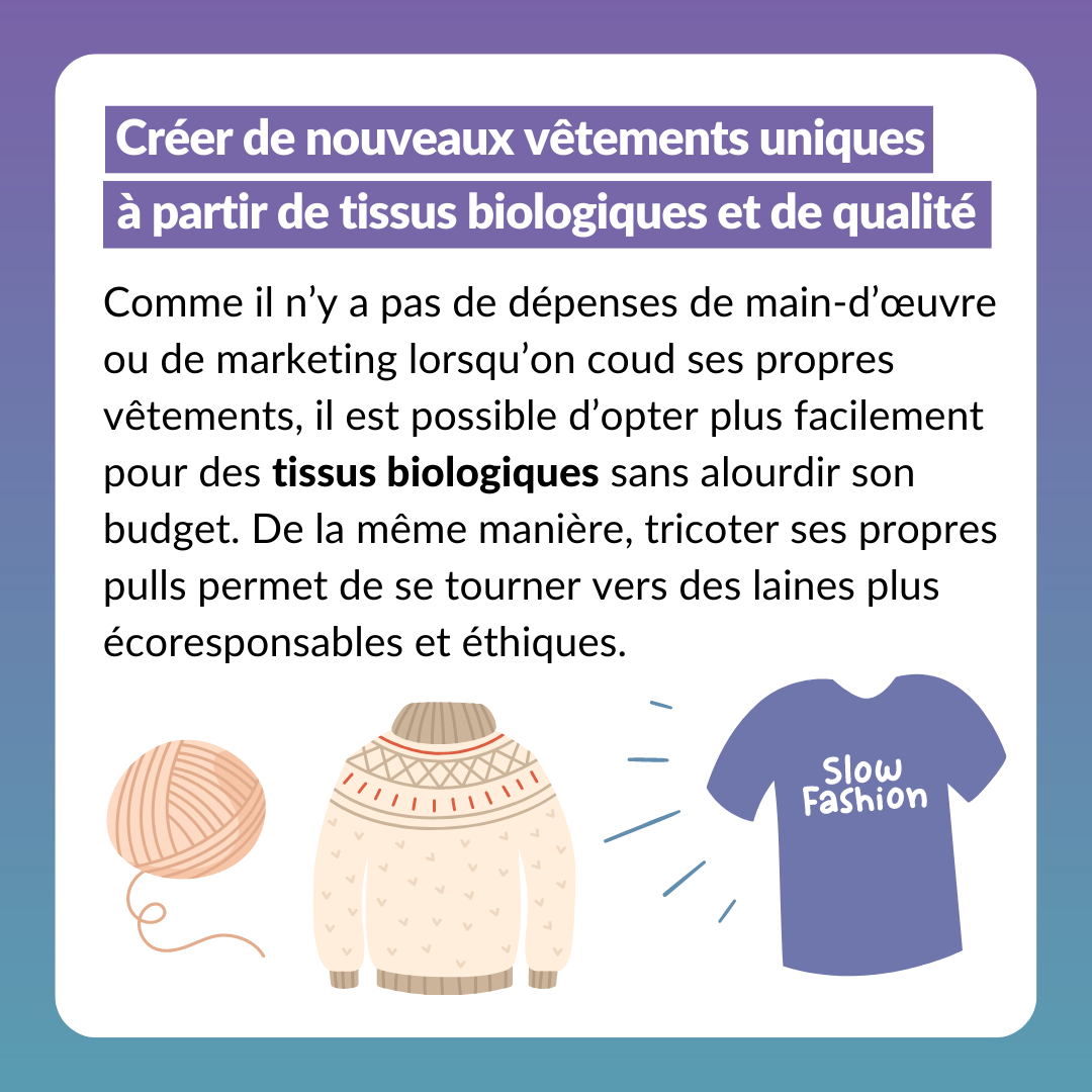 Le DIY favorise le circuit court et permet de fabriquer des vêtements de qualité en gardant la main sur le choix des matières premières et les coûts. Comme il n’y a pas de dépenses de main-d’œuvre ou de marketing lorsqu’on coud ses propres vêtements, il est possible d’opter plus facilement pour des tissus biologiques sans alourdir son budget. De la même manière, tricoter ses propres pulls permet de se tourner vers des laines plus écoresponsables et éthiques.