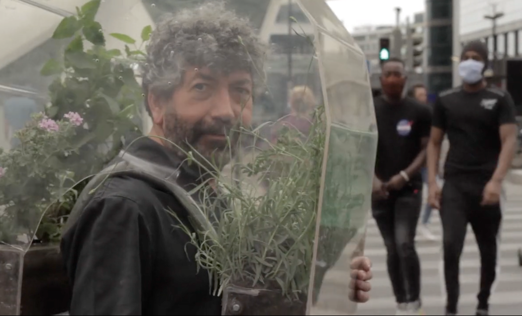 Alors que tout le monde s’est habitué à devoir porter un masque pour limiter les risques de transmission du virus, l’artiste bruxellois continue à porter sa serre miniature sur les épaules. Selon lui, les herbes aromatiques qu’elle contient, comme la lavande, la sauge, le thym et le romarin, contribueraient à assainir l’air et à renforcer les défenses immunitaires pour mieux combattre la maladie.