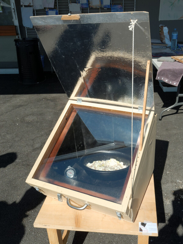 Il s’agit d’une cuisinière en forme de parabole, fonctionnant sur la réflexion des rayons solaires. L’aluminium étant réfléchissant et recouvrant l’intérieur de la demi-sphère, va chauffer la cocotte ou le plat placé en son centre. Ce mode de cuisson demande une exposition parfaite face aux rayons solaires. La cuisinière à parabole doit donc être réorientée environ tous les quarts d’heure pour capter les rayons les plus intenses.