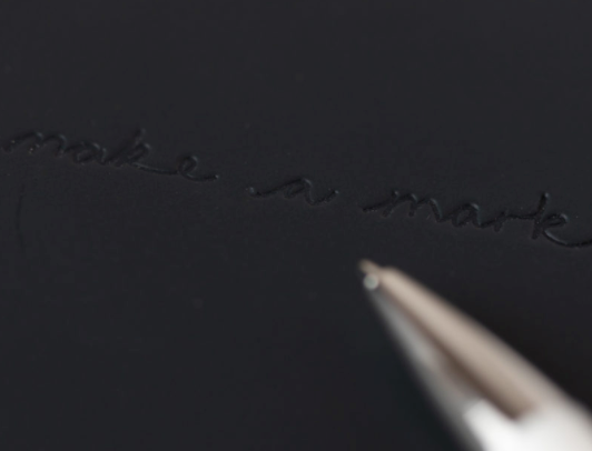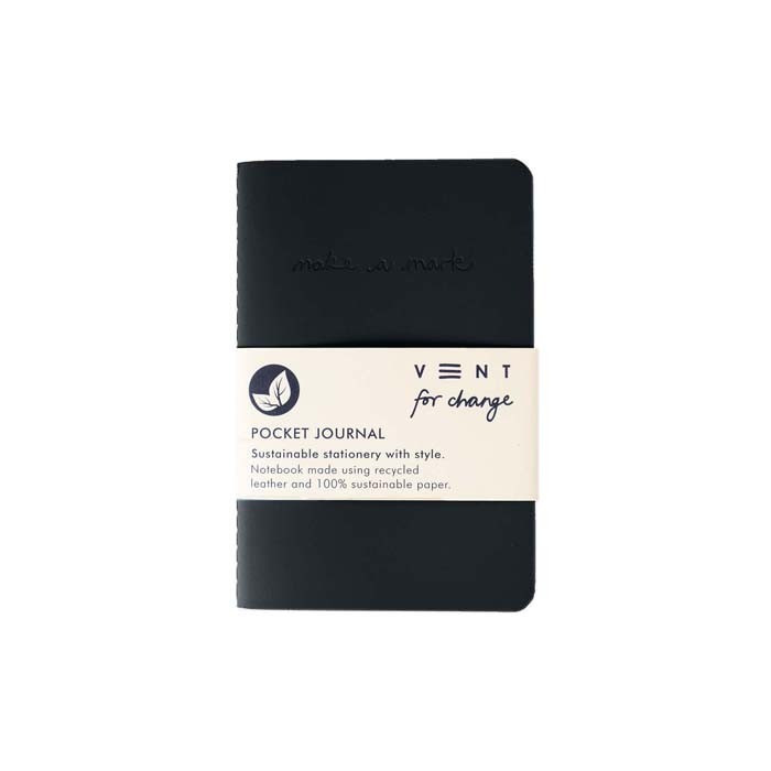Ce très beau journal de poche anthracite contient 64 pages de papier ligné et uni 100 % recyclé. Il est délicatement gravé « Make a Mark » sur sa couverture semi-rigide fabriquée en cuir recyclé à partir de chutes de cuir naturel.