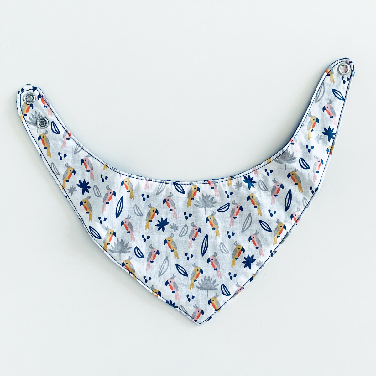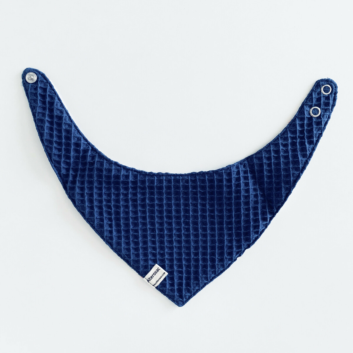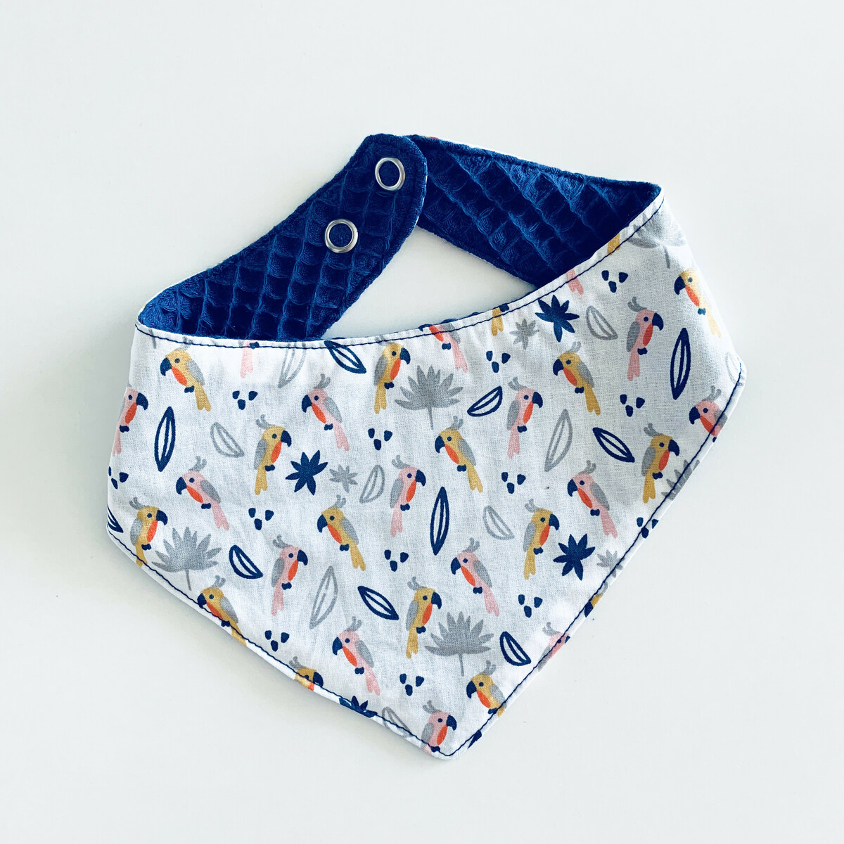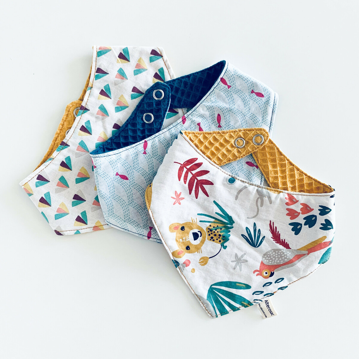 Bavoir réutilisable fabriqué à la main en France. Avec ses deux faces en coton labelisé oeko-tex, il est idéal pour votre bébé : un côté est en tissu imprimé à motif et l'autre est en tissu absorbant en nid d'abeille. Motif aléatoire selon arrivage.