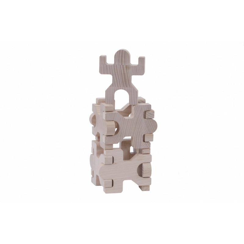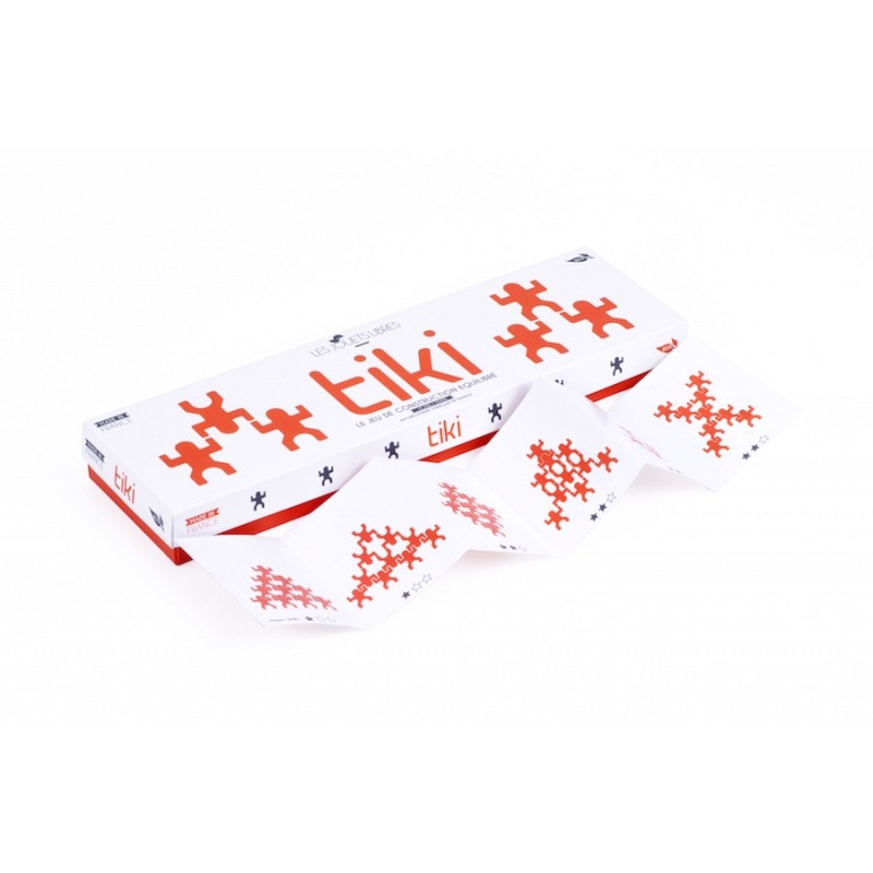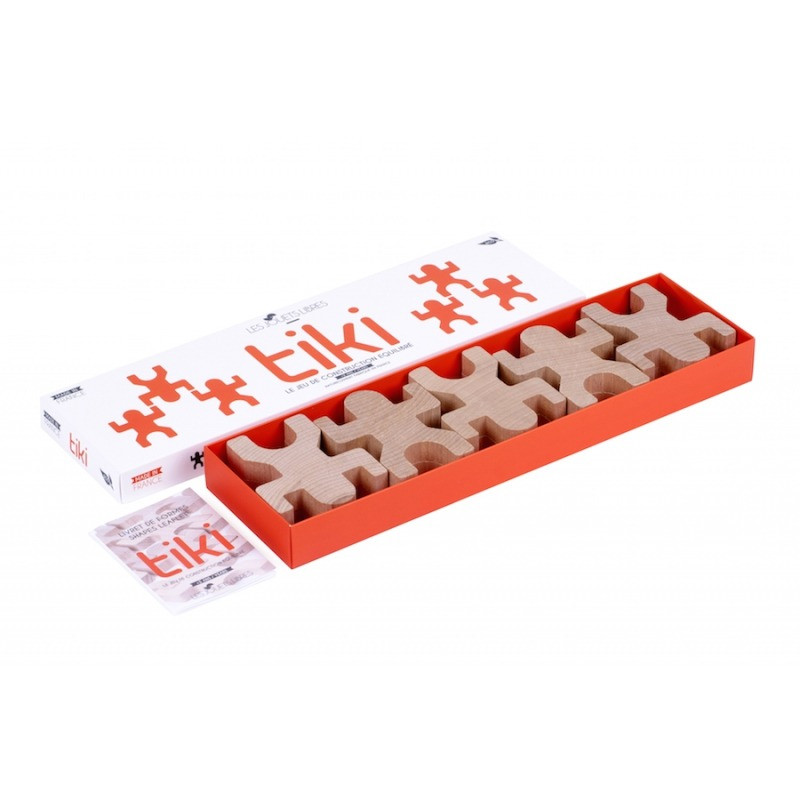 Tiki, ce sont 10 pièces en bois en forme de bonhommes totem. Elles s’imbriquent toutes entre elles pour créer des formes ou des figures en 3 D. Leur format est assez grand, de façon à ce que chaque pièce puisse être manipulée par les plus petites mains. Les personnages en bois se rangent dans une boîte en carton.