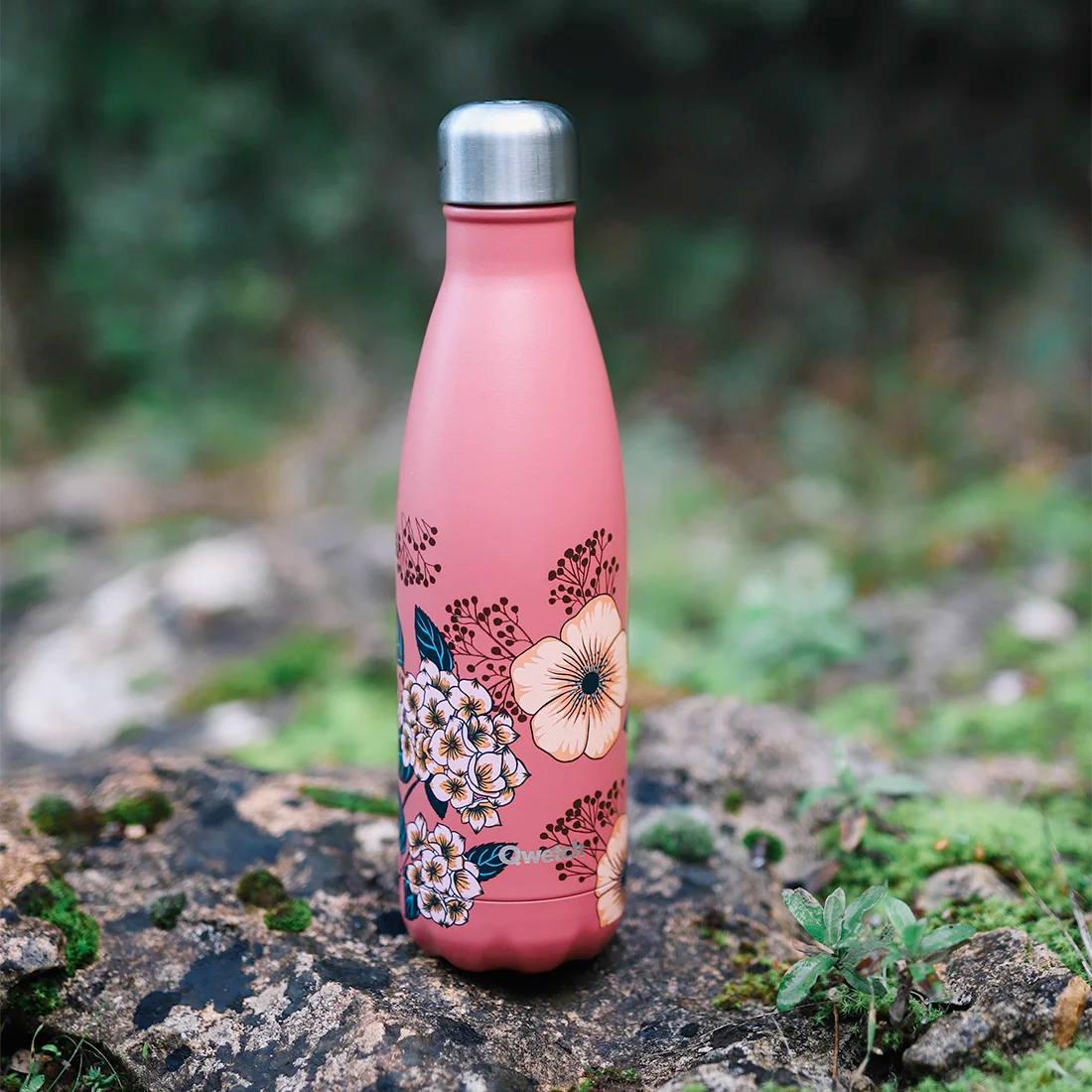 Bouteille Qwetch Anémones isotherme en inox de 500 ml. Elle maintient votre boisson chaude pendant 12 h ou votre boisson froide pendant 24 h.