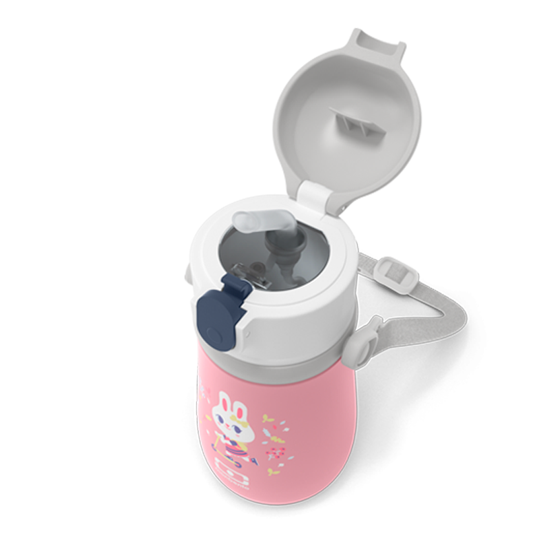 La bouteille MB Stram rose Bunny se compose également d’un couvercle, lui-même protégé par un cache. Une paille est intégrée au couvercle : elle est amovible, ce qui facilite le nettoyage, et lestée, de manière à rester bien en place, quelle que soit la position dans laquelle la bouteille est tenue par l’enfant.