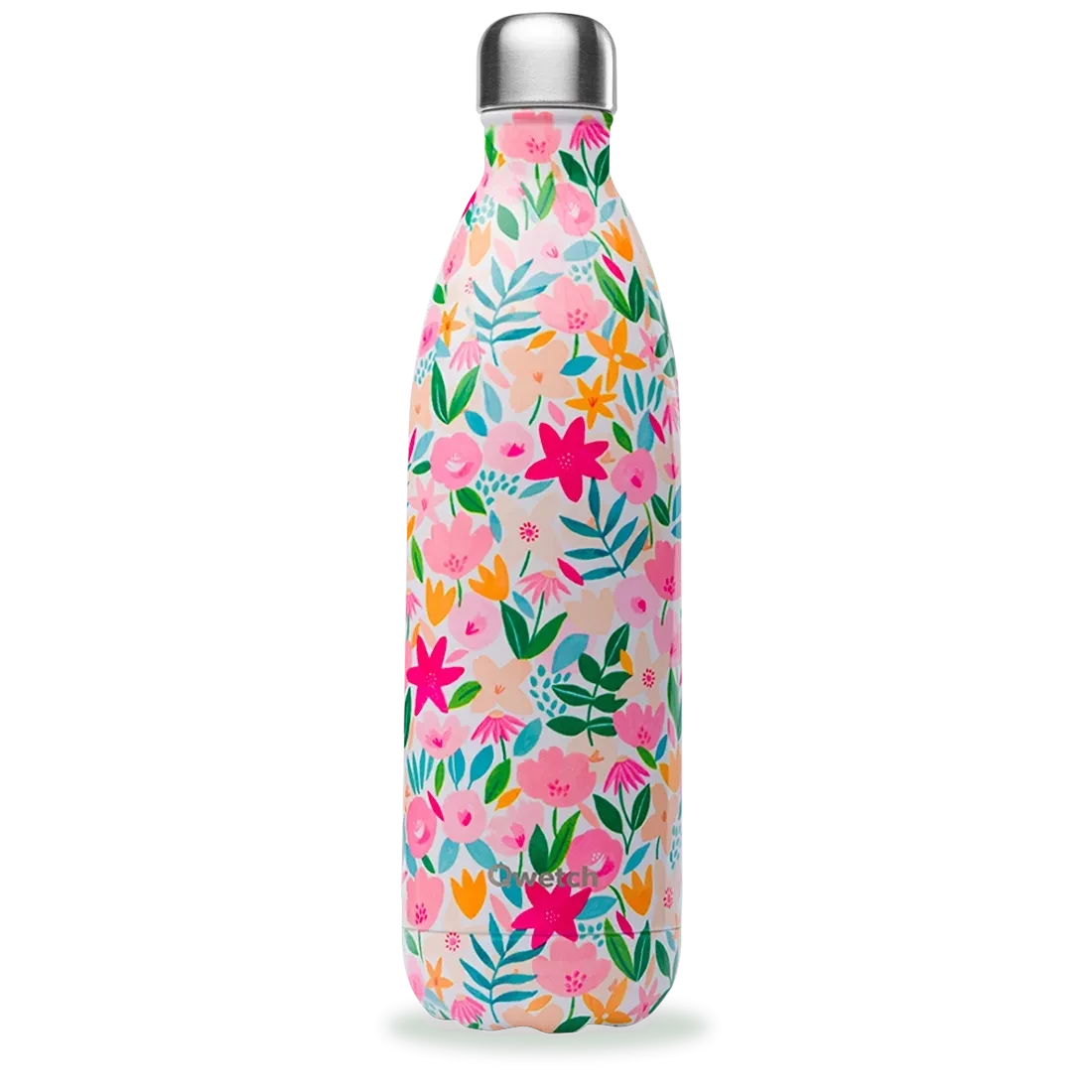Bouteille Qwetch inox Flora Rose de 1000 ml. Elle est isotherme et maintient votre boisson chaude pendant 12 h ou votre boisson froide pendant 24 h.