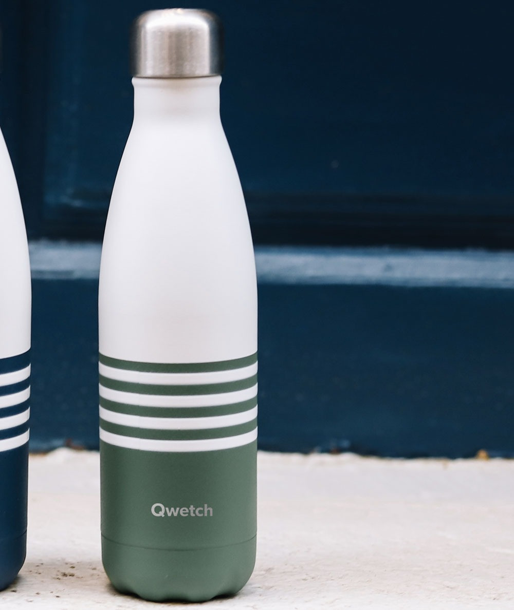 Pour sa collection de bouteilles isothermes « Marinière », Qwetch reprend le motif du célèbre maillot de matelot et son modèle Kaki combine les énergies de la terre et de l’océan. Ainsi, où que vous alliez, Qwetch vous propose des contenants vous permettant d’emporter vos boissons froides ou chaudes.