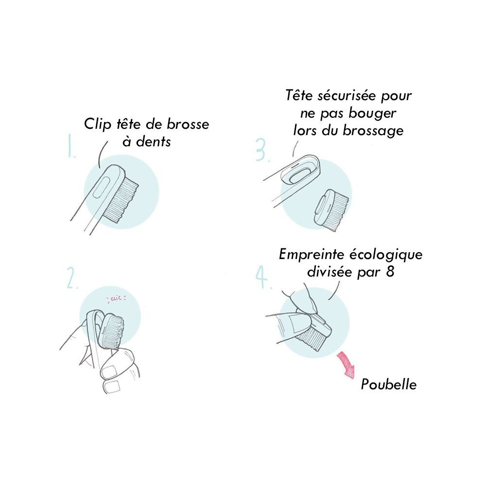Son utilisation ne diffère pas de celle d’une brosse à dents classique. Il suffit d’utiliser du dentifrice classique ou solide pour vous brosser les dents. Rincez et voilà. Lorsque les poils sont abîmés, on ne jette pas la brosse à dents ! On retire simplement la tête obsolète et on la change avec une neuve. Pour ce faire, c’est très simple, pas besoin de tournevis, pas besoin d’y passer des heures non plus. Avec votre pouce, appuyez sur le petit bouton à l’arrière de la tête et tirez les poils avec l’autre main. La brossette se désolidarise de la brosse à dents. Rincez le manche correctement en enlevant les résidus de dentifrice éventuel. Prenez une nouvelle tête et clipsez-la à la place de l’ancienne. En 30 secondes chrono, vous avez une « nouvelle » brosse à dents dans les mains.