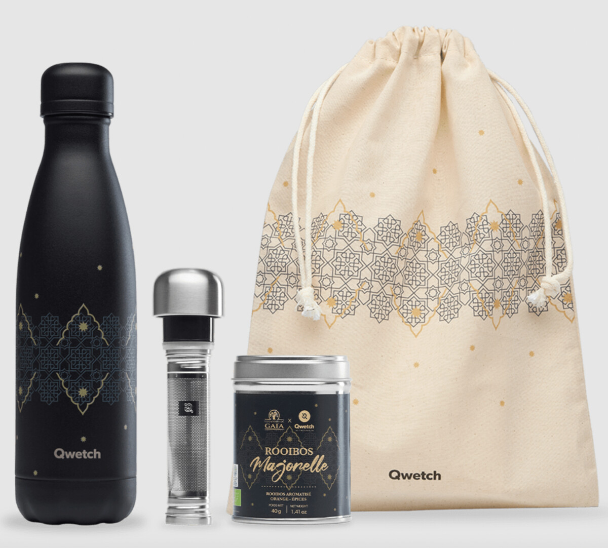 - Le coffret contient : une bouteille isotherme 500 ml, un bouchon infuseur 9 cm, une boite de Rooibos orange et épices les Jardins de Gaïa 40 g et un pochon en coton bio