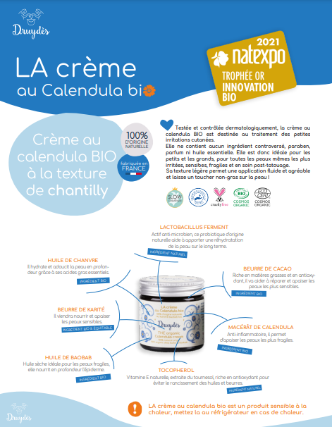 - Ingrédients : Beurre de karité*, Macérat de calendula*, Huile de baobab*, Huile de chanvre*, Beurre de cacao*, Ferments*, Vitamine E naturelle.