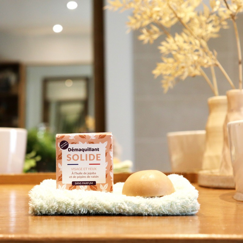 Ingrédients : beurre de karité*, huile de jojoba vierge*, huile de pépins de raisin*, argile rose, tensioactif non ionique, amidon de maïs, glyceryl stearate, cire de carnauba*, tocopherol.