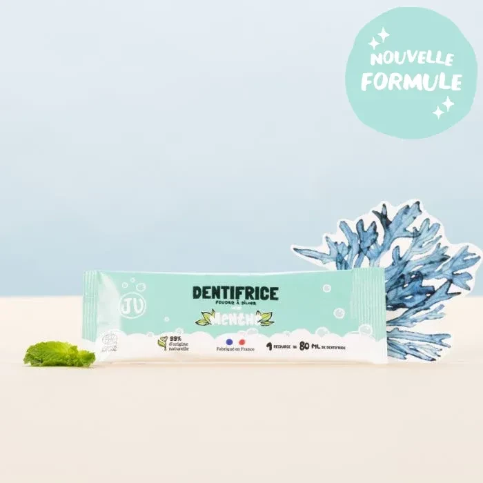 - Pour créer votre dentifrice menthe JU, vous pouvez suivre ces étapes : 1. Ajoutez de l'eau tiède jusqu'à la bulle toute blanche (soit 72ml d'eau). 2. Versez votre recharge de dentifrice en poudre à diluer (8gr) 3. Refermez le bouchon bien fort et secouez le tout. 4. Attendez 20min