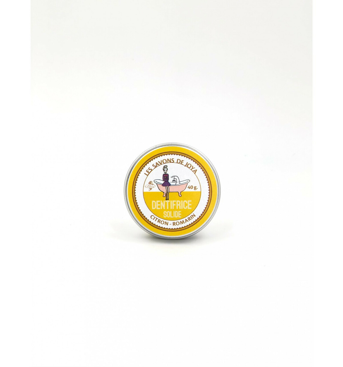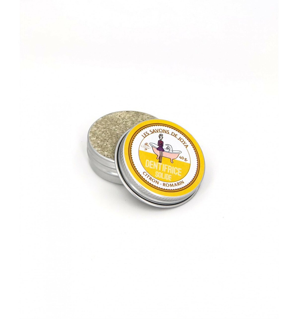 Ingrédients : carbonate de calcium, xylitol, beurre de cacao, argile blanche, argile verte, tensioactif SCS, acide stéarique, glycérine (végétale), erylite, huiles essentielles de citron et de romarin.