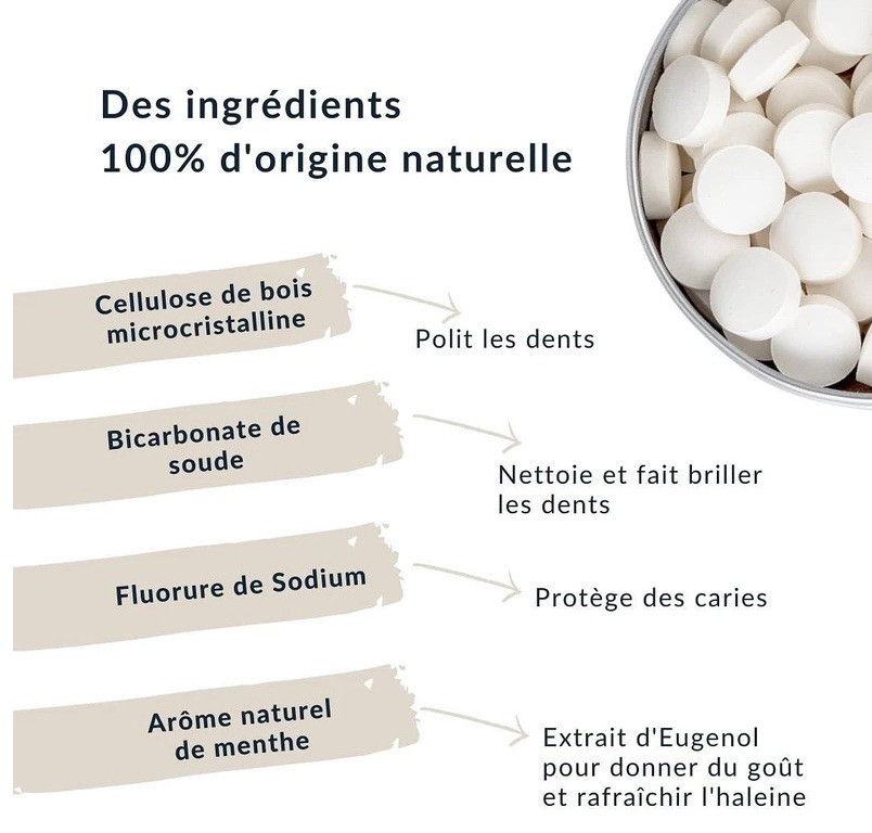 - Les pastilles de dentifrice contiennent du FLUOR de sodium (1450 ppm)