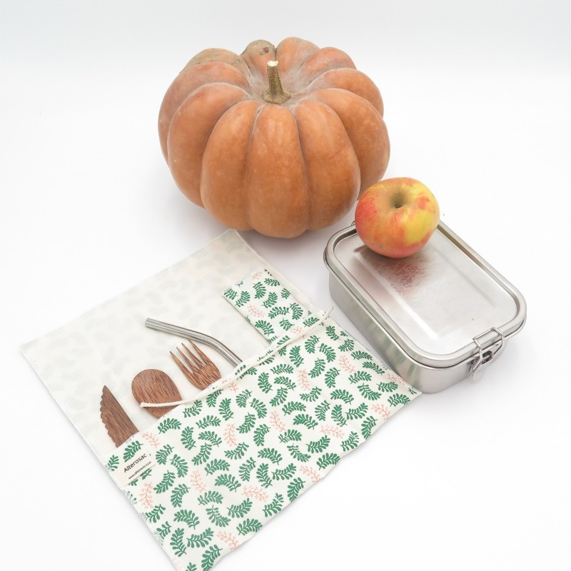 Un joli étui cousu main dans les ateliers d'Alterosac en Haute-Savoie pour transporter ses couverts. Plusieurs compartiments permettent de les organiser et de les séparer. Une petite serviette est fournie avec l'étui.