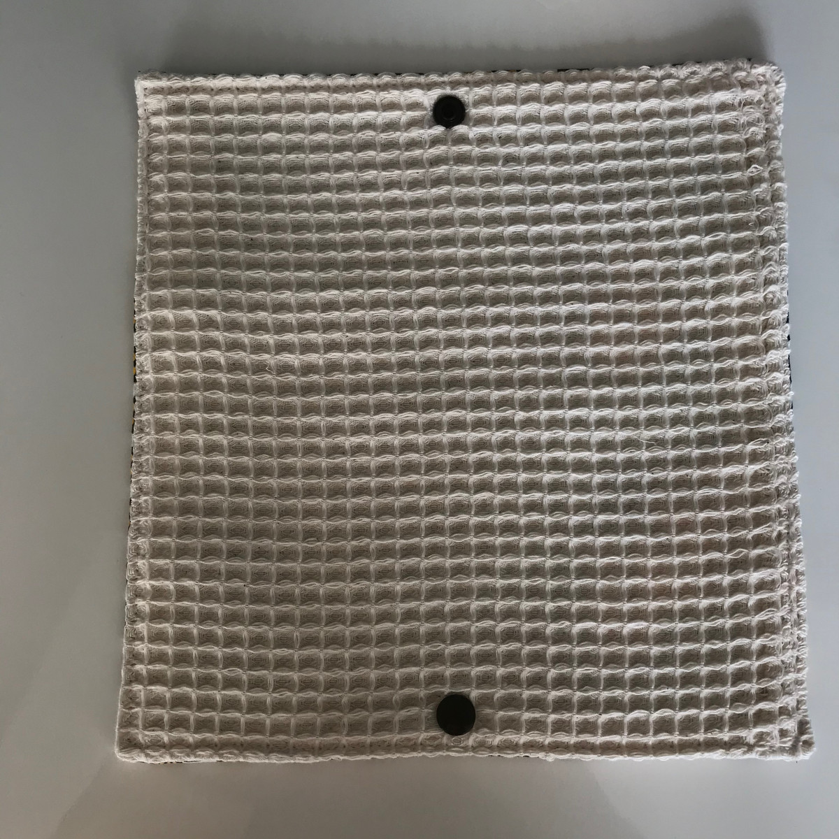 - Matière : Une face au motif coloré en coton et une face en nid d’abeille de couleur écru