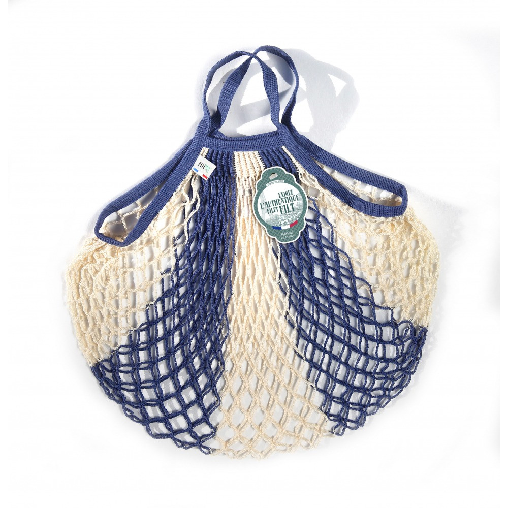 Les filets à provisions en coton offrent le double avantage d'éviter les contenants plastiques à usage unique et permettent le transport de fruits et légumes dans un matériau durable. Cet authentique filet bicolore se pare du bleu jean et de l'écru pour conjuguer son plus bel effet. Article disponible à partir du 04/05/2022.