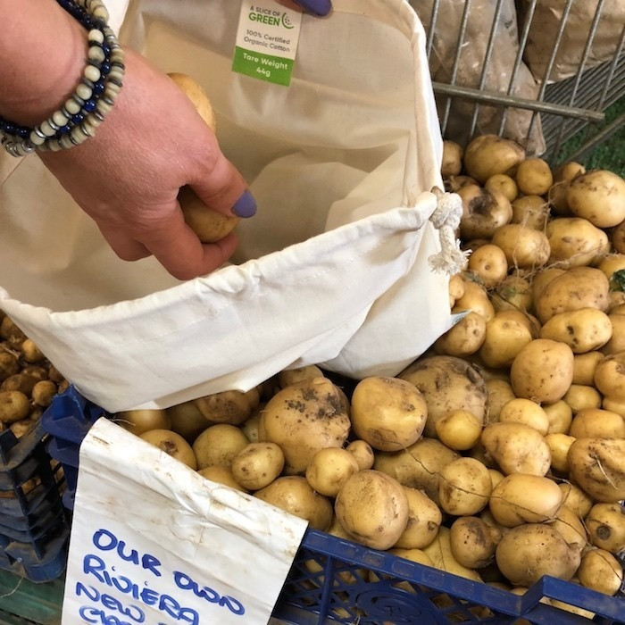 Avant de partir faire vos courses, emportez avec vous ce grand sac à vrac 34 x 38 cm, en le glissant dans votre sac à main. Petite astuce pour ne jamais l’oublier : après usage, rangez-le systématiquement dans votre sac. Une fois sur place, remplissez ce grand sac en coton biologique des légumes que vous aurez choisi, par exemple des pommes de terre. Lors de la pesée, précisez le poids du sac à votre primeur : 57 grammes. En cas d’oubli, sachez que son poids est toujours indiqué sur l’étiquette présente à l’intérieur du sac.