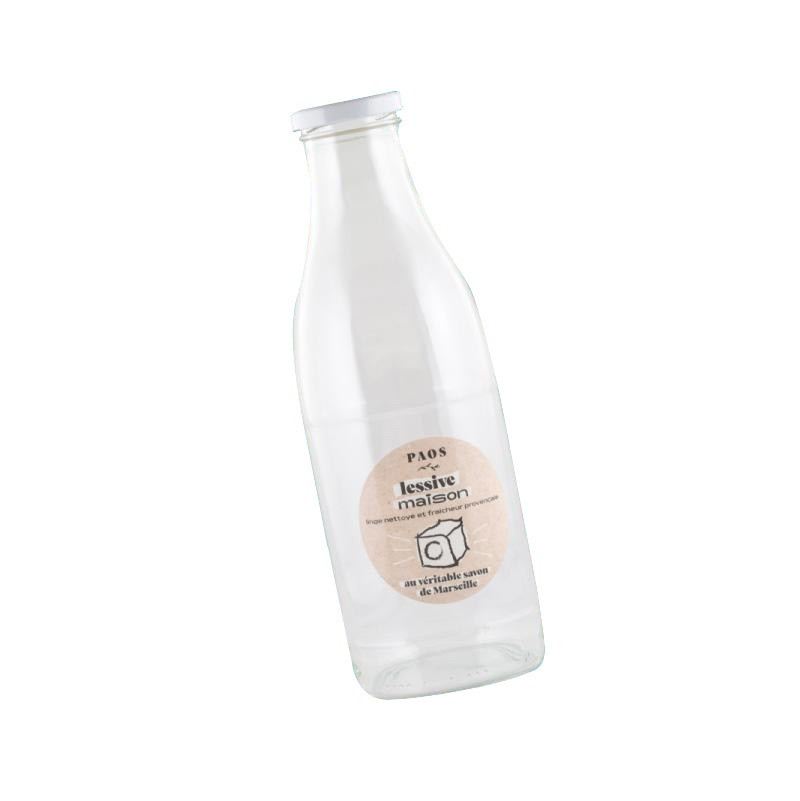 - 1 bouteille en verre d’une contenance d’un litre, sur laquelle est apposée une étiquette biodégradable pour vous permettre d’identifier votre lessive.