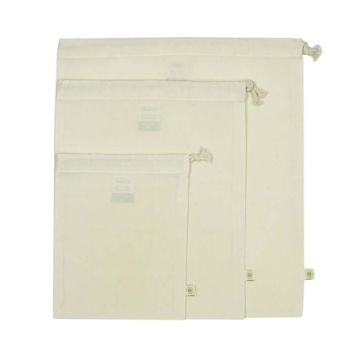 Le lot comprend 3 sacs à vrac en coton biologique, de tailles différentes :