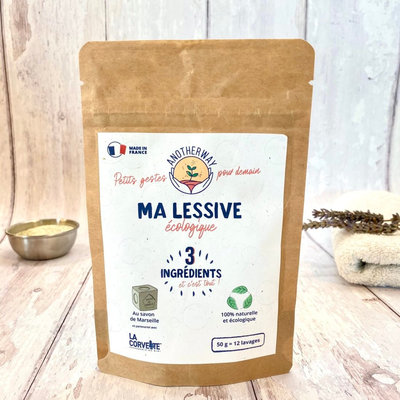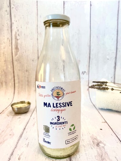 Ainsi, Anotherway propose également de la lessive écologique, composée uniquement de trois ingrédients : du véritable savon de Marseille, du bicarbonate de soude et des cristaux de soude. La lessive est préparée à Marseille par l’ESAT avec lequel la marque collabore.
