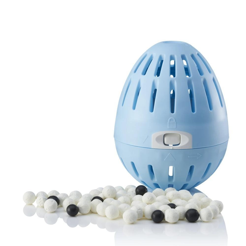 Composition: les granulés minéraux blancs sont composés de tensioactifs, de stabilisateurs, d'adjuvants et de liants biodégradables. Les billes minérales gris foncé sont composées de tourmaline, et adoucissent le linge. L'œuf est quant à lui en plastique sans BPA.