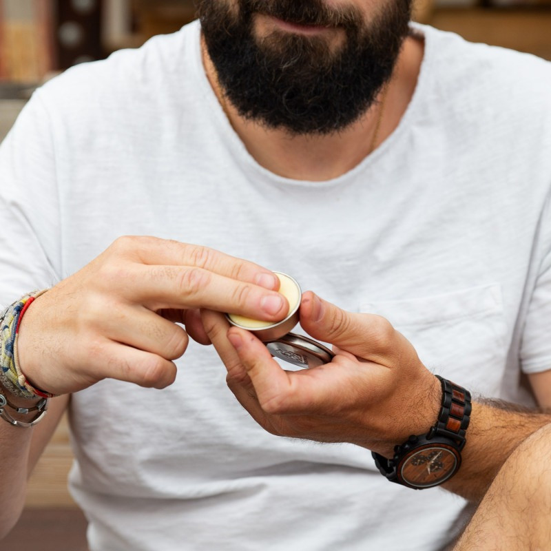 Ingrédients : beurre de cacao (Theobroma cacao seed butter*), cire de carnauba (Copernicia cerifera cera*), parfum, benzyl alcohol, eugenol, limonene, linalool, vitamine E et huile de tournesol (Tocopherol, helianthus annuus seed oil)* ingrédients issus de l’agriculture biologique.