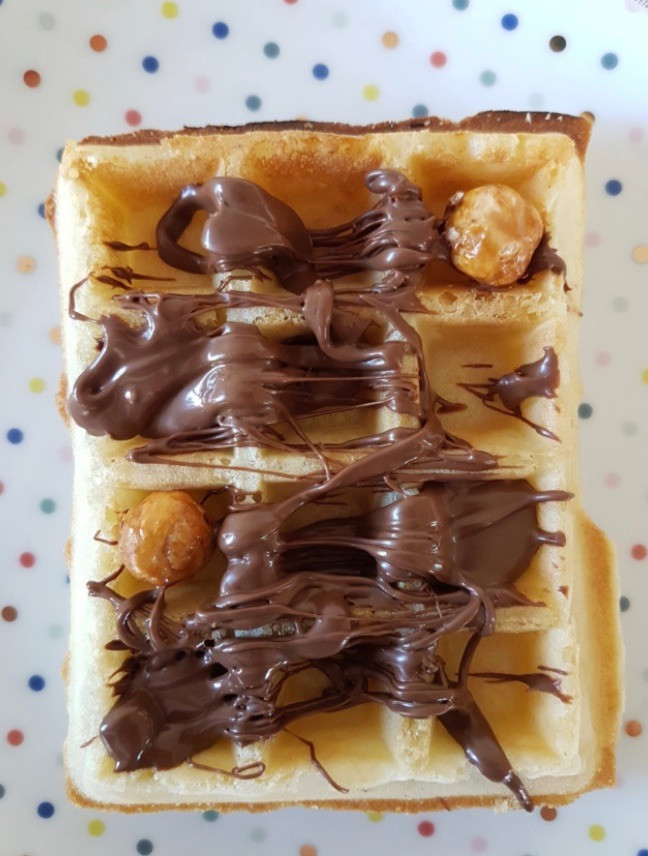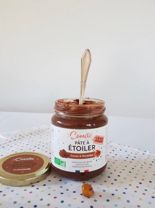 Sucre de Canne roux **, Matières grasses végétales (huile de tournesol* & beurre de cacao), Noisettes* (20 %), Farine de riz*, Cacao** (8 %), Lait écrémé*, Extrait de vanille* (traces possibles d’autres fruits à coque)