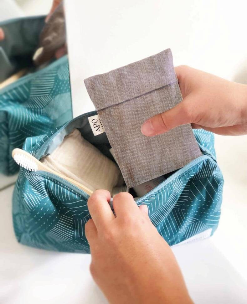 Si vous n’avez pas de savon ou de cosmétiques solides, vous pouvez glisser dans cette pochette d’autres accessoires du quotidien, comme des lingettes démaquillantes lavables ou des carrés démaquillants, des protections hygiéniques ou encore des mouchoirs.