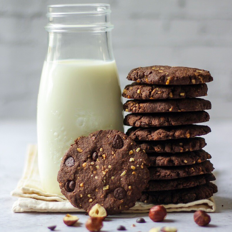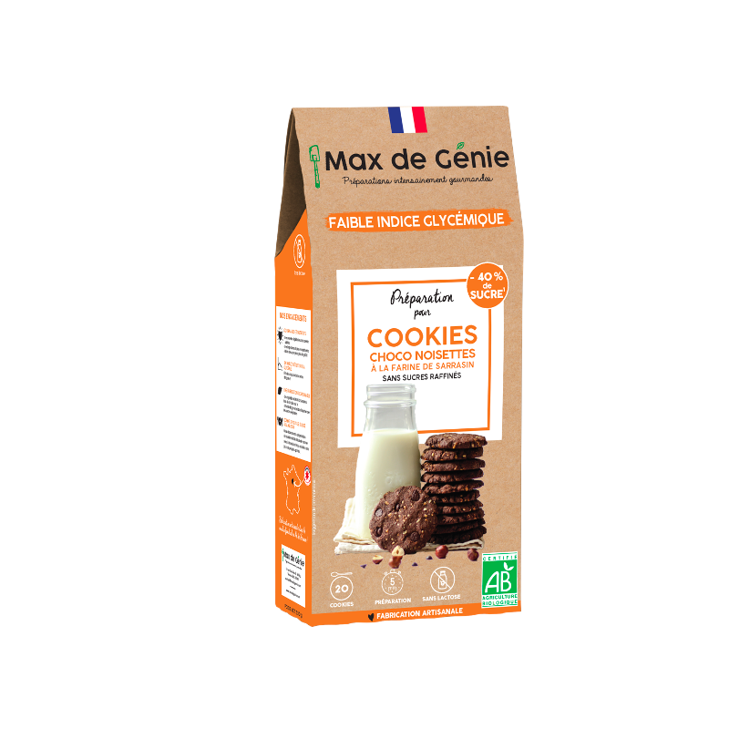 Farines (orge mondé*, noisette* [16 %], sarrasin* [10 %]), sucre de fleur de coco*, pépites de chocolat** (masse de cacao, sucre de fleur de coco, beurre de cacao), poudre de cacao**, éclats de noisettes*(6 %), poudre de psyllium*, bicarbonate de sodium.