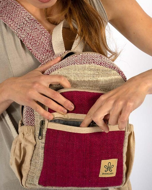 La couleur rouge grenade de la poche avant s’accorde parfaitement au ton beige naturel de ce petit sac à dos éthique. Il est parfait pour un look décontracté. Il est confectionné à la main au Népal, dans du chanvre et du coton. Ce produit est issu du commerce équitable.