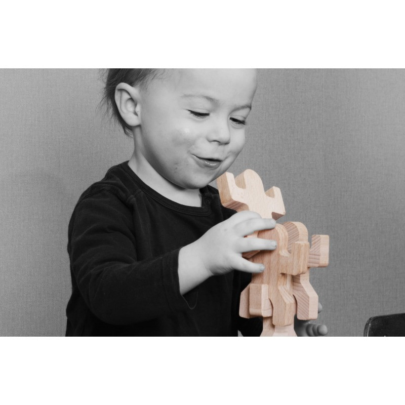 Ainsi, les tout petits à partir de deux ans pourront se familiariser avec les emboîtements à la manière des premiers puzzles, en assemblant les Tiki en deux dimensions d’abord. Puis de nouvelles possibilités apparaissent en faisant tenir les bonhommes debout. Les personnages peuvent alors servir à la mise en scène d’une histoire : la ronde des Tiki par exemple. Les tout petits apprécient particulièrement de démolir : improvisez un bowling avec une petite balle ou construisez une tour à ses côtés.
