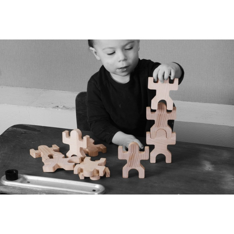 En adéquation avec la pédagogie Montessori, les pièces pour jeu de construction en bois Tiki participent à l’éveil des sens, ainsi qu’au respect du rythme d’apprentissage de l’enfant et de son besoin d’autonomie. Le design des 40 bonhommes en bois Tiki a nécessité de longues heures de travail et pourtant il paraît tellement simple et minimaliste. L’enjeu étant justement de permettre à l’enfant d’exprimer le plein potentiel de son imagination sans être distrait par des couleurs vives ou des fonctions sonores. En touchant, en manipulant, en assemblant, puis en recommençant et en combinant différemment les 40 pièces pour jeu de construction en bois, les enfants découvrent de manière concrète des notions telles que l’équilibre, l’imbrication, les formes, les poids, la hauteur, la symétrie... Cela les aide à développer des compétences comme la patience, la logique, la motricité fine, la persévérance, l’autonomie ou la coopération.