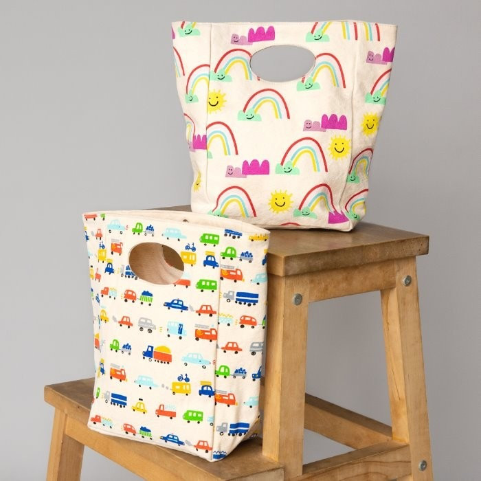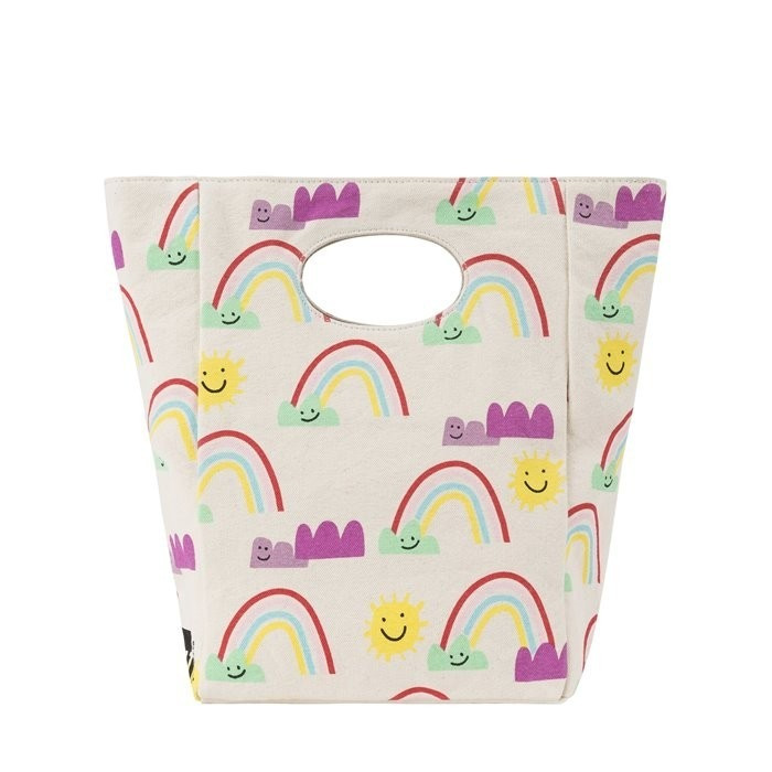 Transportez à la main votre repas dans ce joli sac imprimé arc-en-ciel en coton biologique et sa doublure protectrice en polyester. Sa grande contenance vous permet de transporter votre lunch box, votre gourde réutilisable et un dessert pour votre déjeuner.