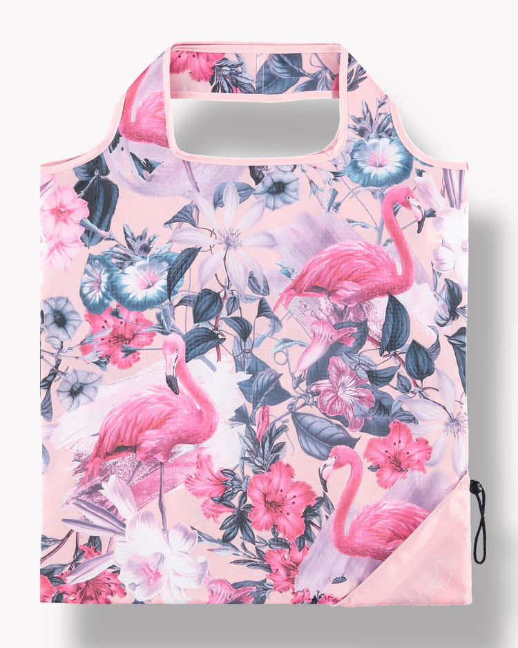 Sac réutilisable Flamingo tropical de Chilly’s élaboré à partir de bouteilles de plastique recyclées. Très pratique pour les courses, sa contenance est de 20 L.