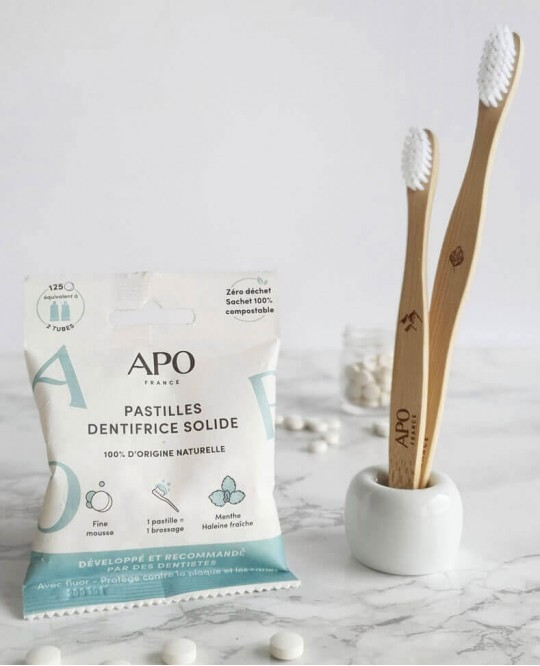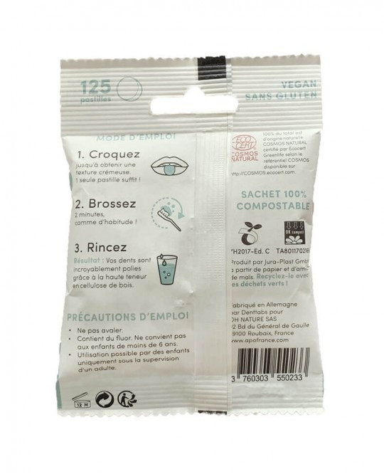 Ces 125 pastilles de dentifrice à croquer sont conditionnées dans un sachet fabriqué à partir d’amidon de maïs et compostable. Plus besoin de consommer et de jeter des tubes de plastique non recyclables !