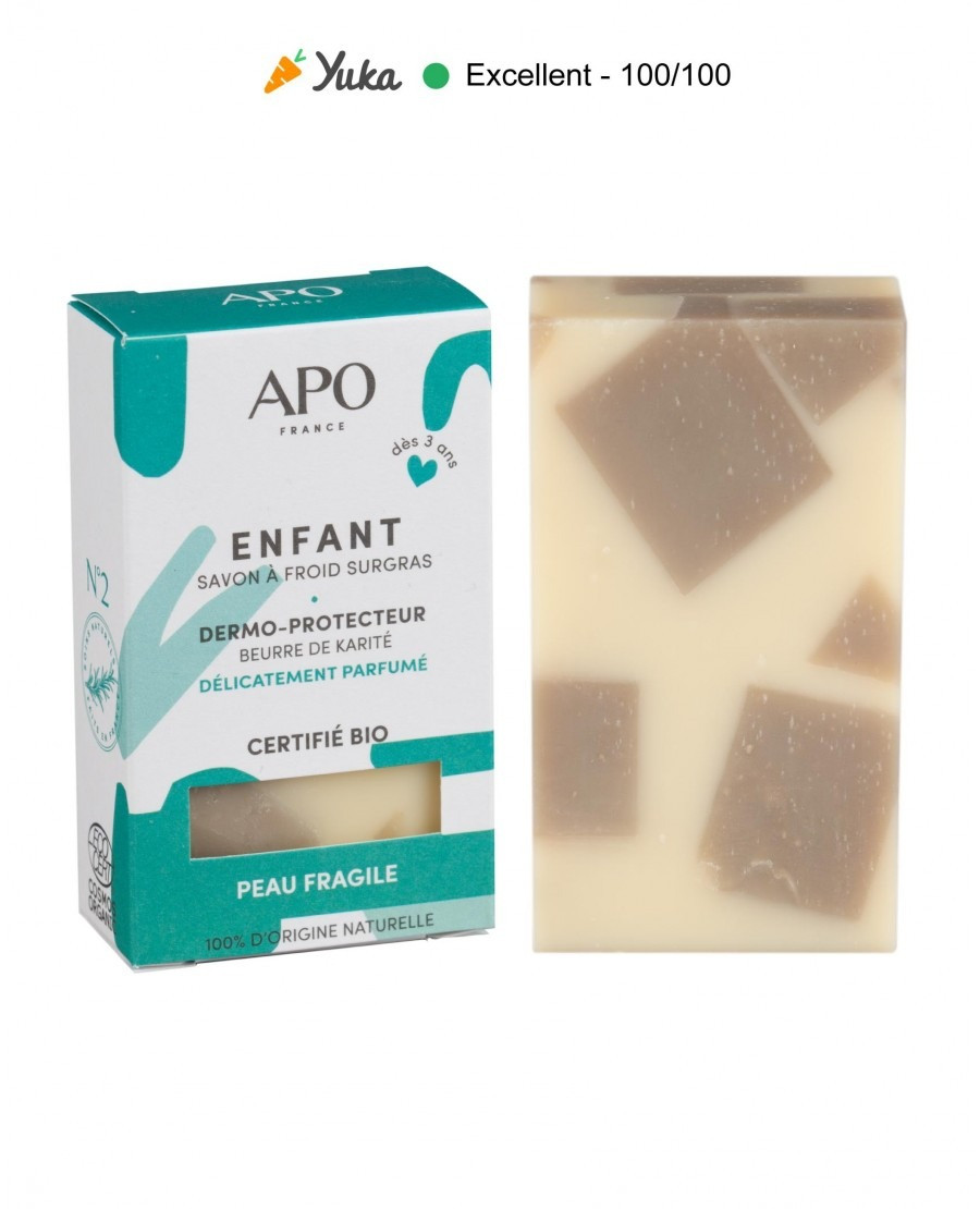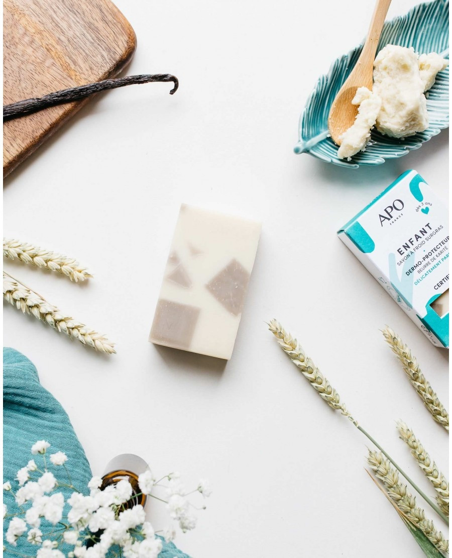 Ce savon surgras à 8 % lave et préserve la peau des enfants de plus de 3 ans. Ce savon multi-usage est obtenu par saponification à froid. Il s’utilise pour se laver les mains, le visage, le corps ou pour l’hygiène intime.