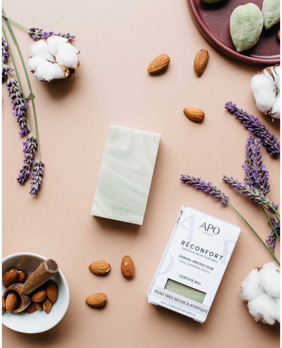 Ce savon surgras à 8 % est fabriqué à la main par saponification à froid. Multi-usage, il convient aux peaux atopiques et très sèches. Il est enrichi en huile d’amande douce dont les propriétés sont reconnues pour apporter un réconfort et adoucir les peaux les plus sèches. Ce savon végane est fabriqué en France.