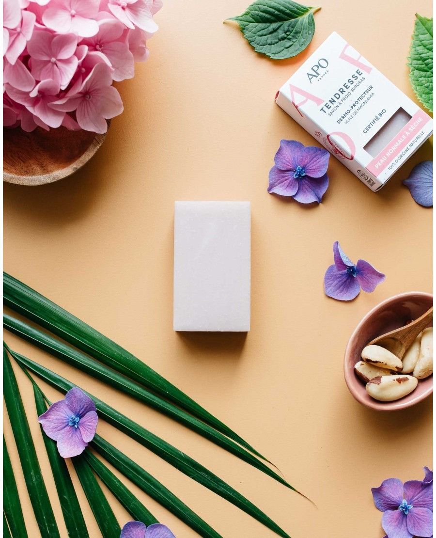 Chouchoutez votre peau avec ce savon tendresse, qui est adapté aux peaux normales à sèches. Multi-usage, il contient de l’huile de macamadia pour nettoyer en douceur vos mains, votre corps et votre visage. Fabriqué en France.