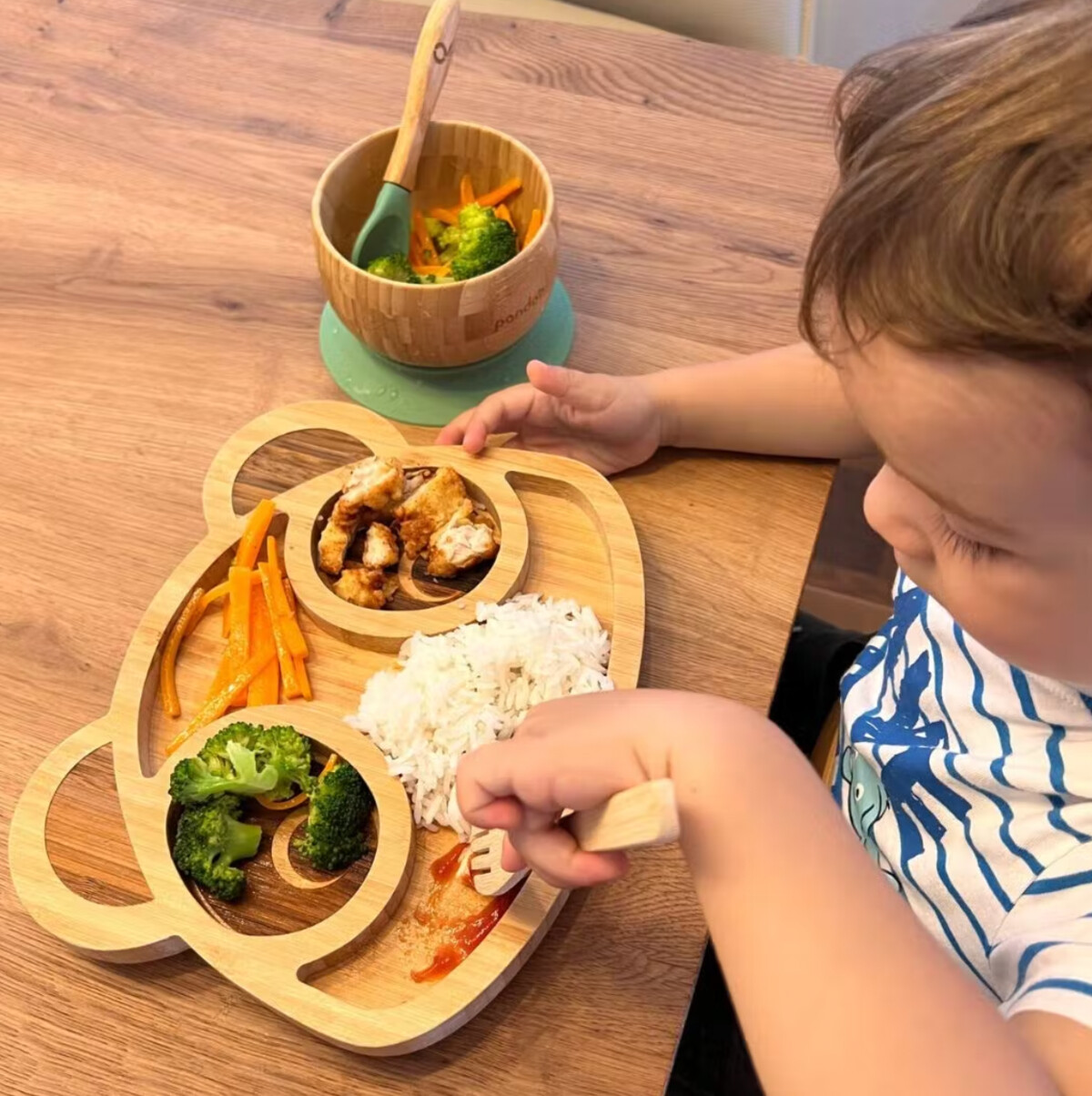 - Composition : 1 assiette panda avec silicone jaune | 1 bol en bambou avec silicone en turquoise | 2 cuillères en bambou avec silicone en turquoise et jaune