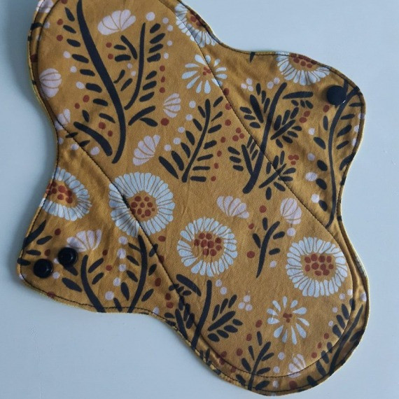 Serviette hygiénique en coton bio lavable Fleurs Moutardes - Maxi - 26,8 cm